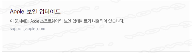애플 보안 사이트 문서의 내용은 Apple은 고객 보호를 위해 보안 문제에 관한 조사를 마치고 패치 또는 출시 버전을 일반에 공개할 수 있을 때까지는 보안 문제를 공개하거나, 논의하거나, 확인해 주지 않습니다. 이 문서에는 최신 출시 버전이 나와 있습니다. 이를 통해 자신에 맞는 기기의 업데이트 버전을 설명받으시면 됩니다.