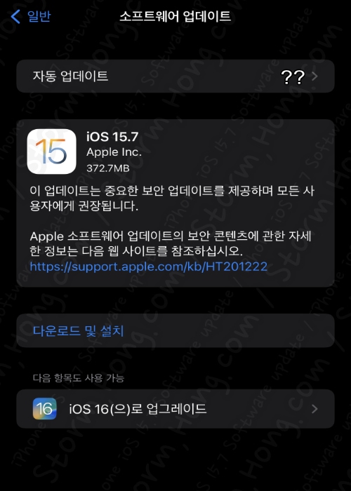 이번 업데이트는 특이하게 iOS 15.7 과 iOS 16 이 동시에 업데이트되어 선택이 가능한 시이 되었습니다, 그렇기에 선택하여 업데이트를 해주시기 바랍니다.