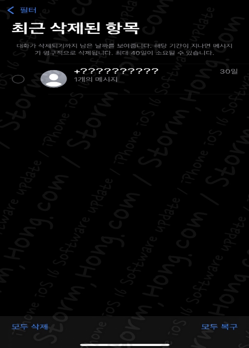 4) 메시지 중 복원하고자 하는 메시지를 선택합니다. 1개를 선택하거나, 모두 복구 또는 모두 삭제할 수 있습니다.