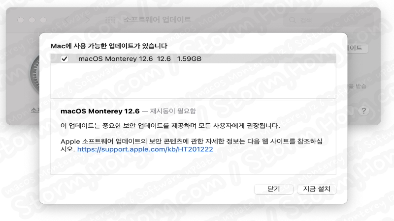 * macOS Monterey 12.6 업데이트 설치 공간은 1.59 GB 입니다. (설치용량은 이전 버전의 업데이트를 하지 않으신 분은 더 큰 용량일 수 있습니다.)