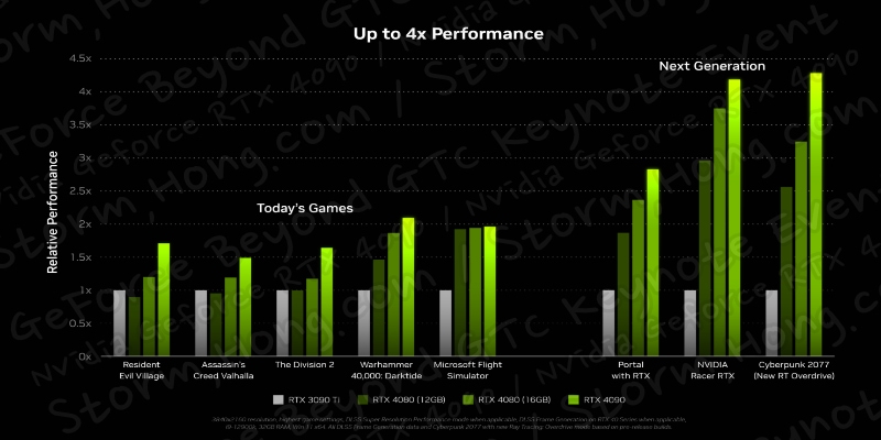 NVIDIA가 이전 그래픽 카드와 비교하여 각 그래픽 카드에 대해 시연한 것처럼 이는 2배의 컴퓨팅 성능 향상 및 2배의 게임 성능 향상 이 될 것으로 보이며, 이는 각각의 그래픽 카드에서도 큰 향상을 얻을 것으로 예상되는 RT 및 Tensor 코어 성능을 고려하지 않은 것으로 알려지고 있습니다. 이에 따라 NVIDIA GeForce RTX 3090 및 Nvidia GeForce RTX 3090 Ti 에 비해 2-4 배의 향상은 매우 이례적인 결과가 될 수 있습니다.