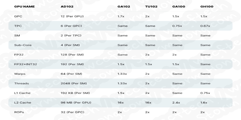 이는 각 하위 코어는 32개의 FP32와 16개의 INT32 장치로 구성되어 총 48개의 장치가 될 것이라고 알려졌습니다. 각 SM 은 128개의 FPS32 장치와 64개의 INT32 장치가 포함되어 총 192개의 장치가 있는 것으로 알려졌습니다. 총 84개의 SM 장치(GPC당 12개) 가 있으며, 총 18,432 개의 코어에 대해 12,288 개의 FP32 장치와 6,144개의 INT32 장치를 라고 합니다. SM 당 64개 랩에 대한 2개의 랩 일정 (32 thread/CLK) 도 포함됩니다. 이는 GA102 GPU 에 비해 코어 (FP32+INT32) 가 50% 증가하고 Wraps/Threads 33% 증가한 것이 특징이라고 알려졌습니다.