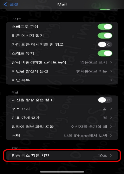 3)) ↑ 위 사진과 같이 전송 취소 지연 시간은 10초이며, '전송 취소 지연시간' 을 누르면 아래와 같이 나나며,