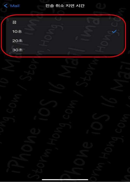 4)) ↑ 위 선택에서 원하는 지연시간을 선택하고, Mail 옆에 뒤로 가기 < 버튼을 눌러 마무리한 후, 설정을