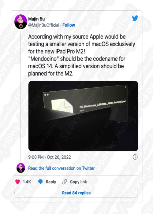 그러나 Majin Bu 라는 닉네임의 트위터 사용자는 새로운 정보에 의하면 macOS 에서 새롭게 출시될 버전의 코드 네임 'Mendocino' 라는 예상, 예측, 루머, 소문의 정보가 새롭게 나타나고 있는 정보에 대해, 'M2 iPad Pro 에 맞는 변화를 탑재' 를 해야 할 것으로 보인다는 의견을 전했습니다.