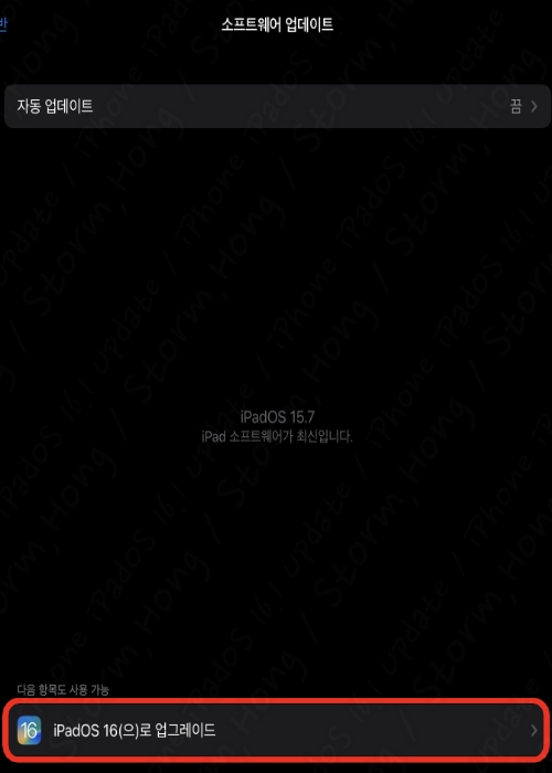 *iPadOS 15.7 의 업데이트가 안 되어 있는 경우 새롭게 iPadOS 15.7 업데이트를 진행하면, ↑ 위와 같은 화면이 나타나며, 아래 iPadOS 16(으로) 업그레이드를 누르면 앞에서 설명한 iPadOS 16.1 업데이트가 나타납니다.