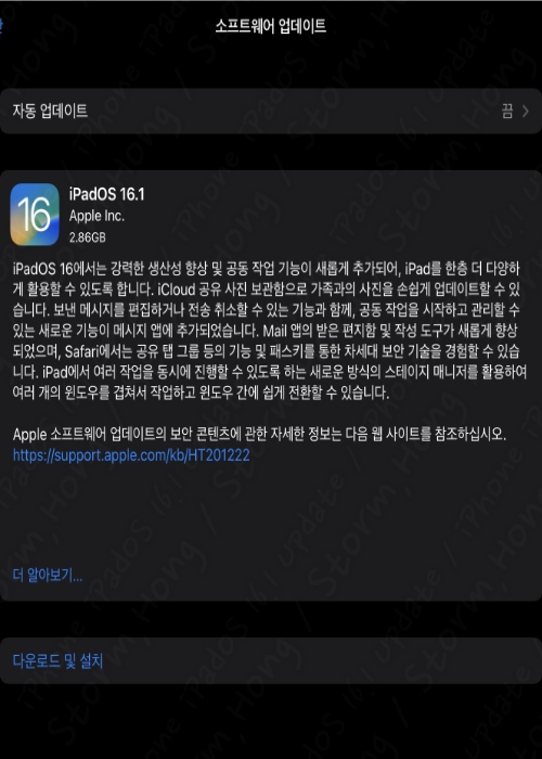 iPadOS 16.1 설치 공간은 약 2.86 GB 입니다. (설치용량은 각 이전에 업데이트하지 않으신분들은 더큰 용량일수있습니다.)이전의 iPadOS 15.7 이하 이전의 업데이트를 하지 않으신 분들은 한꺼번에 설치해야 하므로 용량이 클 수 있습니다.