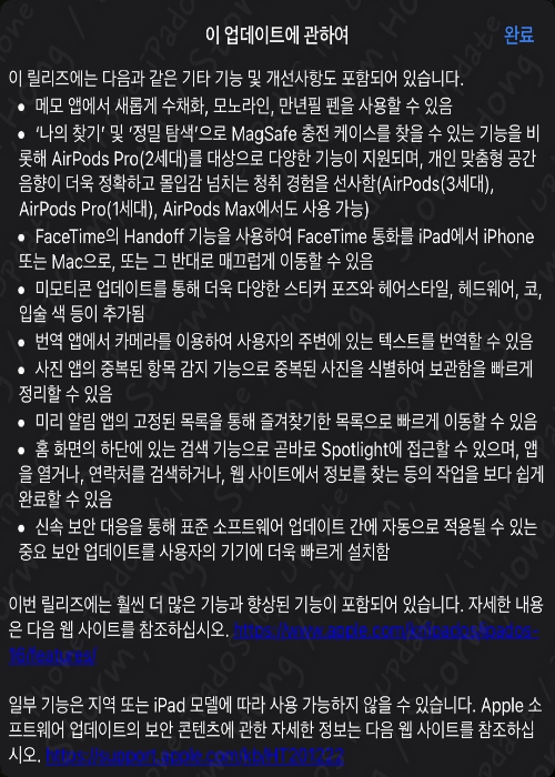 그럼 이번에 업데이트된 iOS 16.1 , iPadOS 16.1 정식 버전의 내용을 살펴보겠습니다.