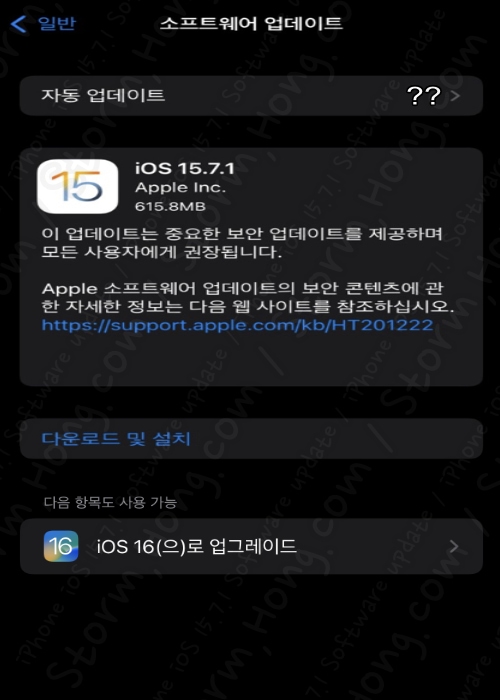 또한 iOS 16 업데이트를 설치하지 못하는 제품을 가지고 있는 경우 iOS 16 (의) 로 업그레이드 메시지를 받을 수 없으며, 만약 iOS 15.7.1 업데이트 화면이 보인다면, iOS 15.7.1 설치가 가능합니다.