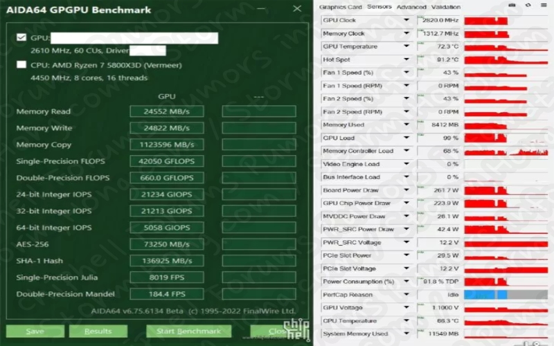 최대 2802 MHz 의 GPU 클럭을 탑재하였으며 262W 전력을 소비하며, GPU 는 AIDA64 GPGPU 테스트에서 42 TFLOPs 의 FP32 의 최고 처리 능력을 발휘할 수 있다고 알려졌습니다. 또한 이 제품은 레퍼런스 모델인지, 어떠한 특정 제품인지는 알려진 사실이 없다는 것입니다.