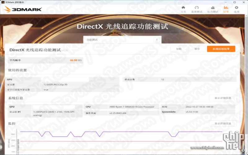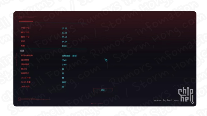 Ray Tracing 을 활성화하여 4K 테스트에서 Cyberpunk 2077 게임 내 벤치마크에 대한 정보도 있었습니다. GPU 는 평균 67.52 FPS 를 기록했습니다.