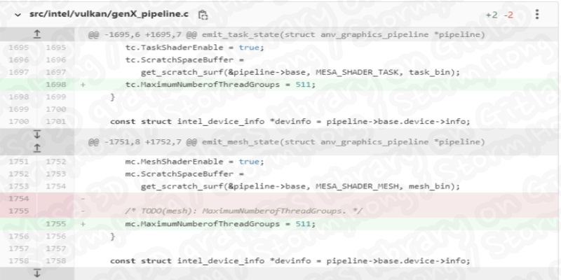 ↑ The Intel Vulkan GenX pipeline in Mesa to fix the width of the maximum number of thread groups by a total of 8. Image source: Mesa 3D graphics library on Gitlab.