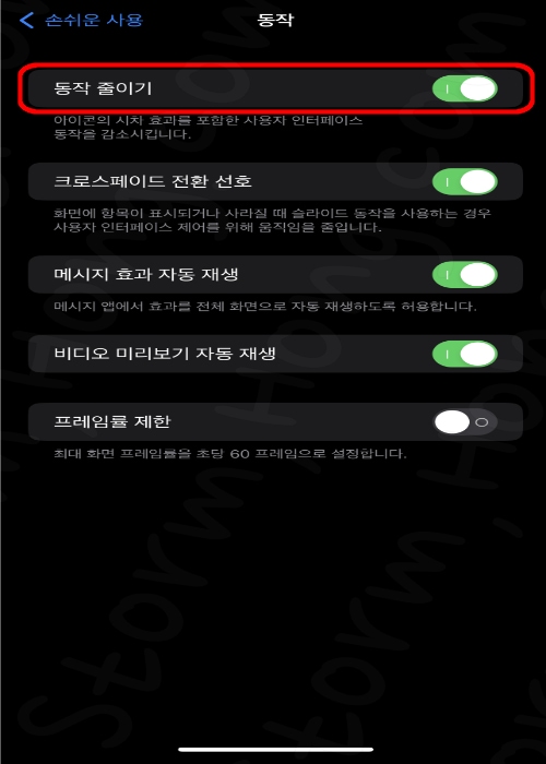 - iPhone 에서는, 디폴트로 동작 감소가 무효가 되어 있습니다. 인터페이스의 애니메이션을 담당하며 프로세서에 부하가 걸려 최종적으로 iOS 16의 배터리 방전 문제가 발생합니다. iOS 16에서 Reduce Motion을 활성화하려면 [Settings]>[Accessibility]> [ Motion ]> [ Toggle On ReduceMotion ] 으로 이동합니다. 또한 Prefer Cross-Fade Transitions 를 활성화할 수도 있습니다.