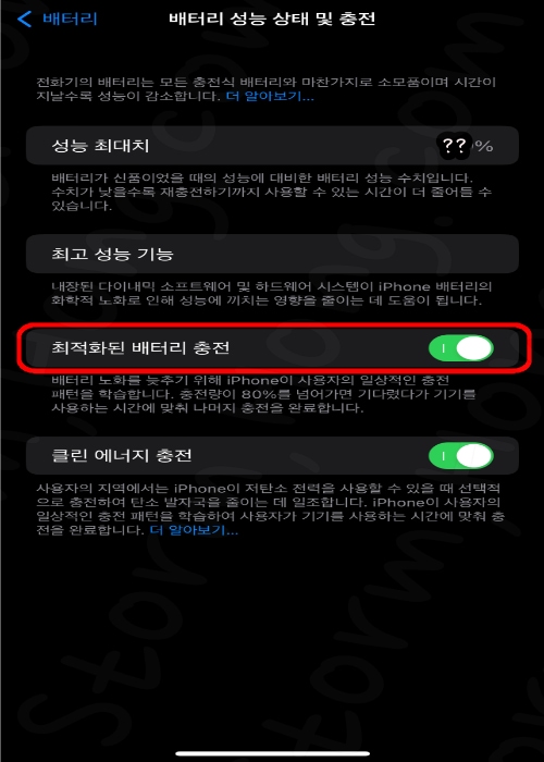 - 배터리 상태를 보호하려면 iPhone 배터리의 과다 충전을 방지하기 위해 Apple에서 제공하는 기능인 Optimised Charging(최적화 충전)을 켜야 합니다. 이 기능을 활성화하려면 [설정(Settings)]> [배터리(BatteryHealth)]> [배터리 성능 상태 및 충전] > [배터리 충전 최적화 (ToggleonOptimized Battery Charging)] 으로 이동합니다.