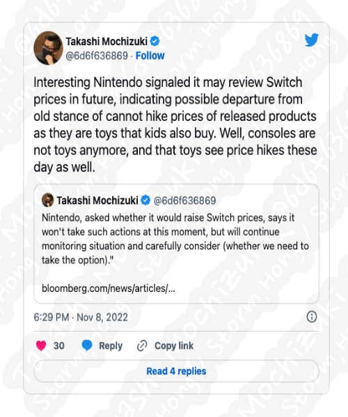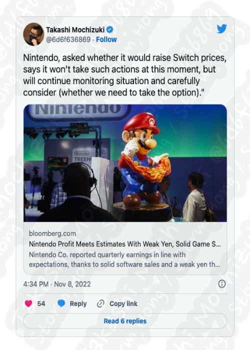 Bloomberg Takahashi Mochizuki 에 의하면, 분기별 수익에 대한 정보가 나타났으며, Nintendo 는 현재 전 세계적으로 1억 1444만 대가 팔린 매우 성공적인 콘솔로 알려졌으며, 가격 인상 가능성에 대해 질문을 받았으며, 이는 당분간 Nintendo Switch 의 가격을 인상하지 않고 상황을 계속 지켜보면서 신중한 검토가 필요할 것으로 보인다는 예상, 예측, 루머, 소문의 정보가 나타났습니다.