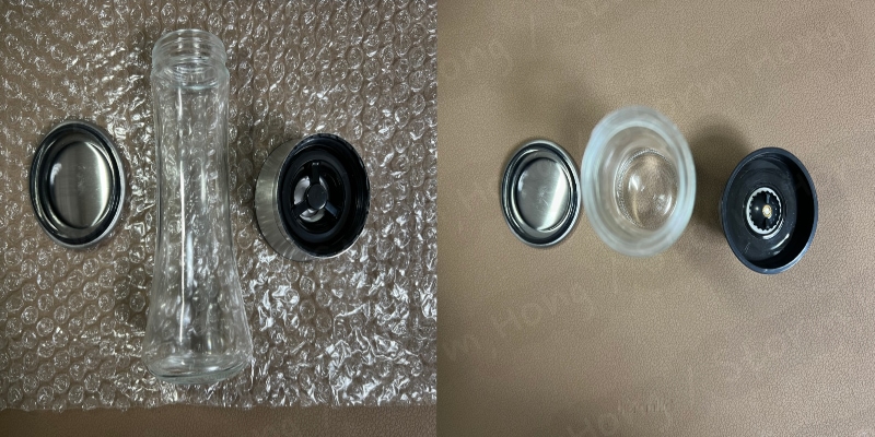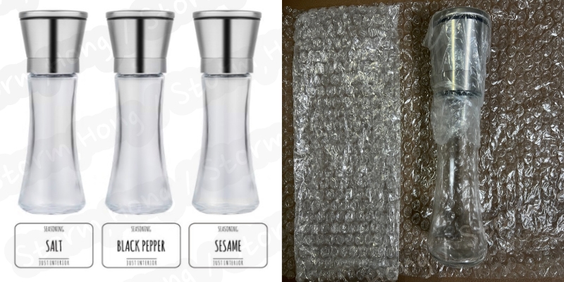 박스오 포장지를 제거하고 나니 본품의 모습이 나타났습니다. 구매 전 사진에서 보았던 내용대로, 모습은 동일했습니다. 아래는 유리 재질의 병, 위는 스테인리스 그라인더, 대부분 상품의 사진과 다른 모습이 나타날 수도 있지만, 약간의 크기도 작을 수 있지만, 차이가 거의 없이 동일한 사진으로 왔습니다.