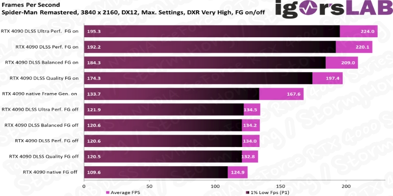 *백엔드의 프레임에서는 AMD FSR 에서 사항이 달라졌으며, 공백이 생기는 구간에서는 NVIDIA Frame Generation 을 사용한 것으로 보인다는 정보도 나타났습니다. Test 에서 이용한 Spider-Man Remastered 게임에서 달성 가능한 최대 FPS 는 231.4 fps 로 DLSS 를 사용하는 네이티브 방식보다 약간 높은 수치로 알려졌습니다. 이는 다른 지표에서 실제로 DLSS 기반 구현과 상당히 비슷하기 때문에 이는 소프트웨어의 병목현상이 일어난 것으로 보인다는 정보도 나타났습니다.