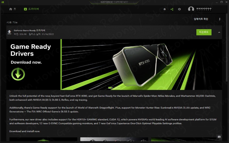이번 NVIDIA GeForce RTX 4080 출시에 힘입어 드라이버 업데이트가 진행되었습니다. 또한 Mavel Spider-Man 에 최적화된 드라이버였으며, Miles Morales (PC용으로 금요일에 출시 예정), Warhammer 40,000: Darktide (11월 30일 출시, 11월 17일부터 사전 주문 베타가 출시됩니다), WRC Generations – Fia 공식 게임 WRC – Fia드라이버는 World of Warcraft: Dragonflight 확장에도 최적되었습니다.