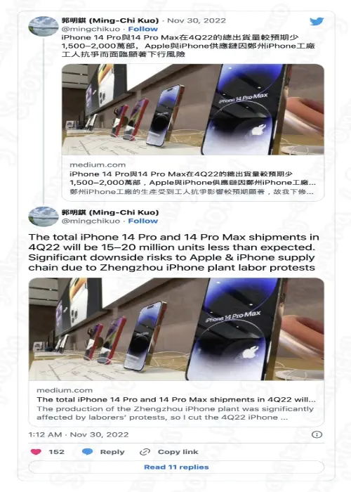 분석가 Ming-Chi Kuo 에 의해 새로운 업데이트와 함께 언급한 데이터 내용을 알렸습니다. 이 정보는 Apple 에서 2022년 하반기 (4분기) 1500만 ~ 2000만 대 정도 출하량을 줄일 수 있다는 예상, 예측, 루머, 소문의 정보가 나타났습니다. 이는 정저우에 있는 조립 공장이 이 지역에서 증가하는 COVID-19 로 인해 일시적인 생산 중단이 될 것이라는 내용이 나타났습니다.
