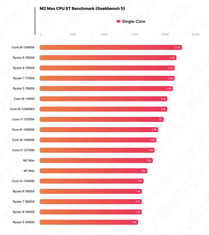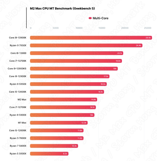 intel 의 Core i9-13900 Raptor Lake 또는 AMD Ryzen 7000 Zen 4 의 최신 CPU 와 비교하면, Apple M2 Max 의 싱글 코어와 멀티 스레드 모두 수치와 비교하면, 차이가 나는 것으로 보입니다. 이에 데스크탑 CPU 는 싱글 코어에서 2000 점수 이상, 멀티 스레드 점수는 20,000 점수 이상을 나타냈습니다. 또한 아직 공개되지 않은 M2 Ultra 는 현재의 x86 부품에 가능한 다가가려는 움직임을 보이고 있다는 예상, 예측, 루머, 소문의 정보가 나타났습니다.