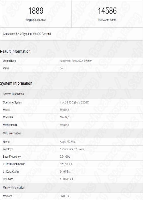성능은 Apple M2 Max CPU 싱글 코어 점수는 1889 점, 멀티코어 점수는 14586 점을 기록한 것으로 알려졌습니다. 이는 M1 Max 의 싱글 코어 1705 점, 멀티 코어 점수는 12,200 점과 비교하면, 싱글 스레드 성능은 최대 10 % , 멀티 스레드 성능은 최대 20 % 향상된 점수로 예상, 예측, 루머, 소문의 정보가 나타났습니다. 이는 큰 폭의 향상으로 보이며, 현재 알려진 정보보다 얼마든지 개선의 여지가 있기 때문에, 공식적인 정보가 나타나기 전까지는 이 정보는 예상, 예측, 루머, 소문에 불과합니다.
