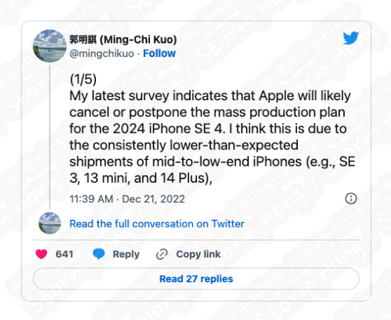 Apple 제품 분석가로 유명한 Ming-Chi Kuo 의 트윗에 의하면, Apple 에서 새로운 iPhone SE 4 에 대한 새로운 정보를 전했습니다. 출시는 연기 또는 취소의 가능성이 높다는 예상, 예측, 루머, 소문의 정보를 전한 것입니다. 또한 Ming-Chi Kuo 는 iPhone 13 Mini, iPhone 14 Plus , iPhone SE 3 와 같은 스마트폰의 출하량이 예상, 예측했던 수량보다 낮다고 합니다.