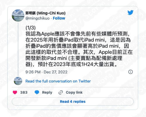 Ben Wood 또한 Ming-Chi Kuo 와 같은 의견을 가지고 있으며, iPad Mini 와 Foldable iPad 와 공하여, 다양한 가격으로 판매할 가능성이 높은 것으로 보인다는 예상, 예측, 루머, 소문의 정보가 나타났습니다. 또한 Foldable 기술에 대한 태블릿 제품군과 다른 행보를 보일 가능성이 있다는 정보가 나타났습니다.