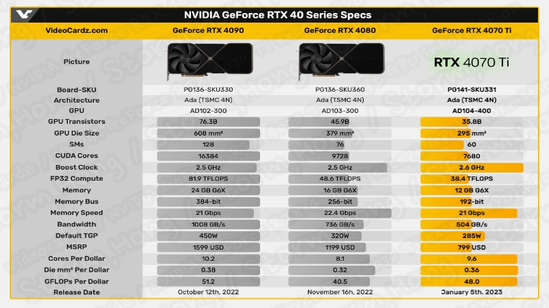NVIDIA GeForce RTX 4070 Ti 는 7,680 개의 코어, 60개 SM 을 지원하는 Ada Lovlace A104-400 GPU 를 사용하는 것으로 알려졌습니다. 또한 풀칩 SKU 로 구성된 것으로 알려졌습니다. 48MB L2 Cache , 192 Bit Bus interface 를 갖추고 있으며, 12 GB GDDR6X 메모리를 탑재한다고 알려졌습니다.