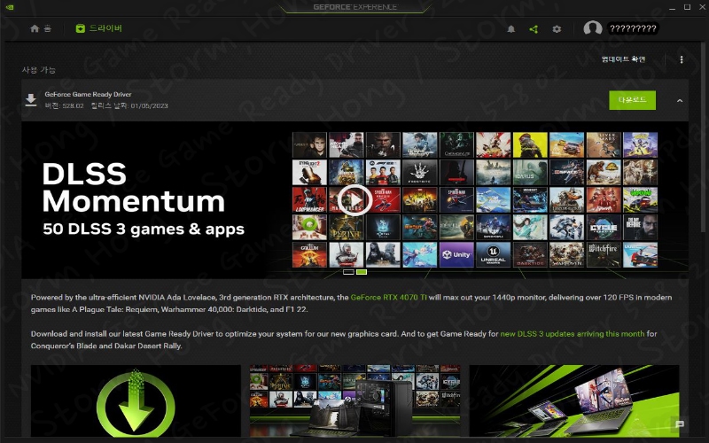 - Game Ready : 새로운 버전 GeForce Game Ready Dirver 528.02 WHQL 을 통해 Conceror's Blade 와 Dakar Desert Rally 에서 NVIDIA GeForce RTX 4000 Series 에서 적용된 DLSS 3 기술을 지원하는 게임에서 최적화가 이루어졌습니다.