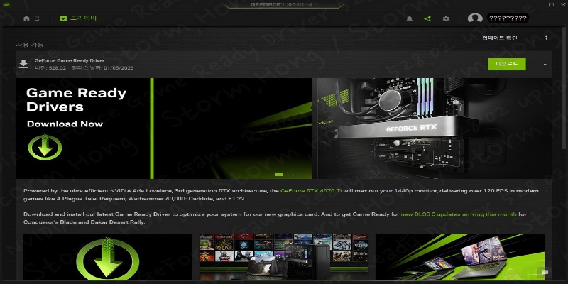 - Game Ready : 새로운 버전 GeForce Game Ready Dirver 528.02 WHQL 을 통해 Conceror's Blade 와 Dakar Desert Rally 에서 NVIDIA GeForce RTX 4000 Series 에서 적용된 DLSS 3 기술을 지원하는 게임에서 최적화가 이루어졌습니다.
