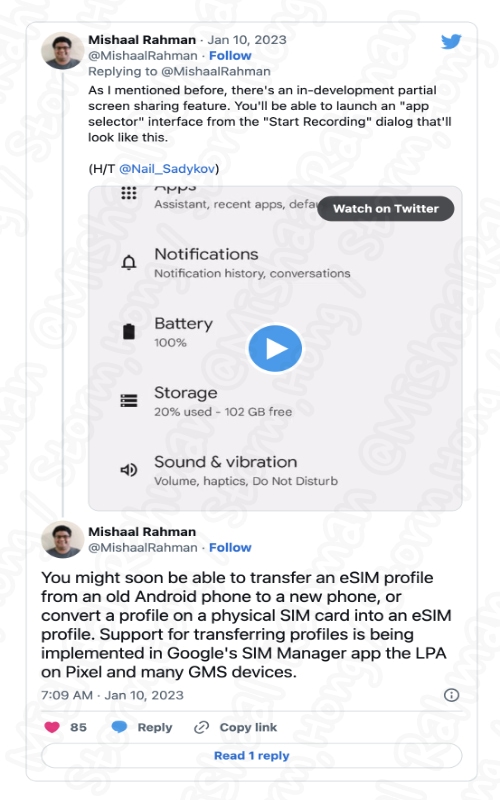 Mishaal Rahman 에 의하면, Android 버전에서 eSIM 프로파일을 새로운 전화기에 SIM 카드 없이 다운로드하여 사용이 가능한 eSIM 을 사용할 수 있을 것으로 보인다는 정보가 나타났습니다. Mishaal Rahman 는 새로운 Android 13 QPR2 베타 2는 'eicc.transfer_enabled_in_non_qs' 라고 불는 새로운 시스템 속성을 가지고 있으며, 이는 무엇을 의미하는지 알아내는 데 코더가 필요하지 않은 것으로 보인다는 예상, 예측, 루머, 소문의 정보를 전했습니다.