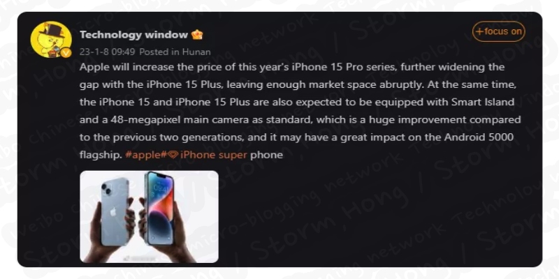Chinese micro-blogging network Technoloy Window 에서 iPhone 15 , iPhone 15 Plus 에는 Dynamic Island (다이나믹 아일랜드) 와 48MP 카메라가 탑재된다고 알려졌으며, iPhone 15 Pro , iPhone 15 Pro Ultra 에 대한 업그레이드 내용은 나타나지 않았습니다.