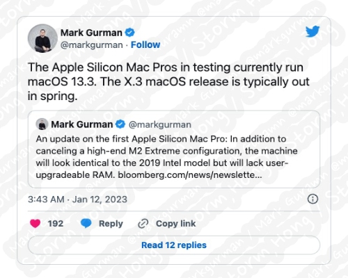[ 트윗을 통한 새로운 업데이트 정보는 MacOS 13.3 이 될 것으로 보이며, 2023년 상반기 출시 될 것으로 보인다는 예상, 예측, 루머, 소문의 정보가 나타났으며, 이는 Mac Pro 가 맞추어 출시가 될 수도 있다? ]