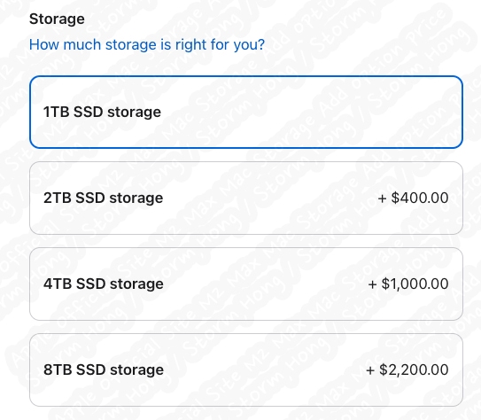 * 16 인치 M2 Pro MacBook Pro 에 기본 모댈은 USD 2,499 ($) 이며 아래 옵션을 추가 구매할 경우 가격은 상승하게 됩니다.