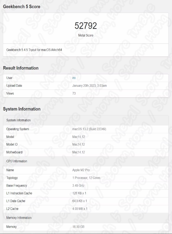 Geekbench 5 Metel Test 에서 특정 테스트한 GPU 성능은 M2 Pro 52,726 점을 기록했습니다. 검사 모델 명은 Mac14,12 로 되어있었습니다. 이 점수는 M2 Pro Mac Mini 에서 효과적인 쿨링 솔루션 덕분에 새로운 14 인치 및 16 인치 MacBook Pro 의 출시 이후 밴치마킹 점수는 나타나지 않았습니다.