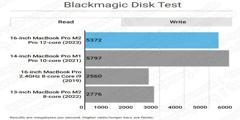 SSD 테스트는 Macword 와 Tom's Guide 에서 나타났으며, 실시간 새로운 M2 Pro 및 M2 Max MacBook Pro 모델의 읽기 및 쓰기 속도에 대한 정보가 나타났습니다. 또한 Blackmagic 디스크 속도 앱을 사용하여, Macworld 2TB 의 저장 공간을 갖춘 16 인치 M2 Max MacBook Pro 에 대한 Test 였습니다.