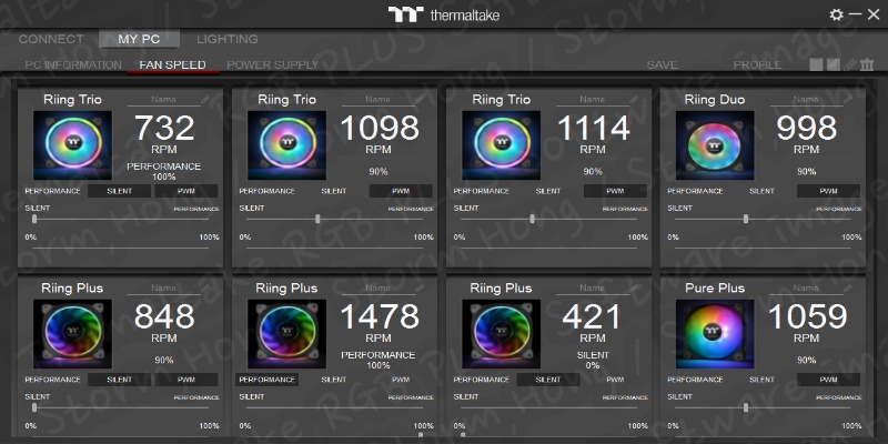 설치된 여러 가지 팬을 프로그램에서 쉬운 RPM 제어를 통한 조절이 가능합니다. 이는 쉬우며, 프로그램에 다양한 RGB 연동팬을 손쉽게 제어가 가능합니다.