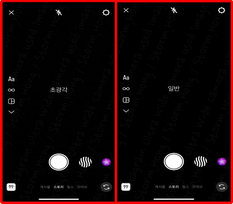이와 같은 기능을 통해 Ultra Wide (초광각) 카메라를 사용할 수 있으며, 이 기능은 비디오와 사진 모두에서 적용하여 사용이 가능합니다. 또한 이 기능은 스토리뿐만 아니라, 릴, 라이브에서도 사용할 수 있는 기능입니다. 표시는 Ultra Wide (초광각) 시 표시는 가운데에 글자가 표시되고 사용가능합니다. 또한 Normal (일반) 의 경우 일반으로 표시됩니다.