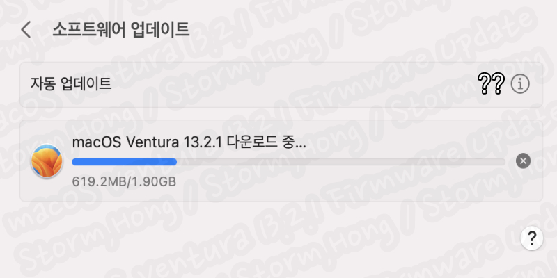 ↑ macOS Ventura 13.2.1 (맥OS 밴츄라 13.2.1) 실제 설치를 진행하면 예상 용량보다 큰 2.53 GB 입니다.