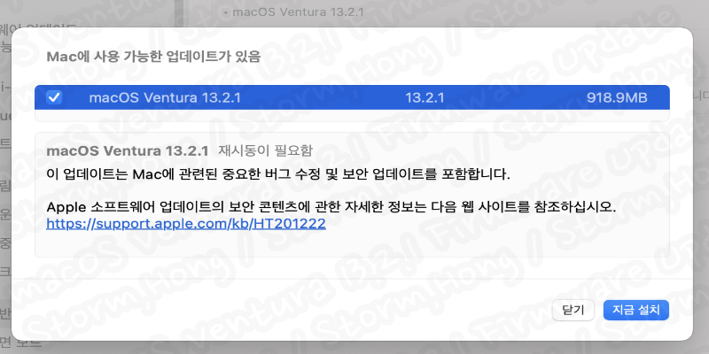 * macOS Ventura 13.2.1 업데이트 설치 공간은 918.9 MB 입니다. (설치용량은 이전 버전의 업데이트를 하지 않으신 분은 더 큰 용량일 수 있습니다.) 용량이 커진 만큼 많은 업데이트 내용이 바뀌었습니다.