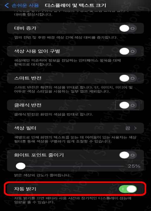 4. " 자동 밝기 전환 탭 " 을 찾아 껐다 켭니다.