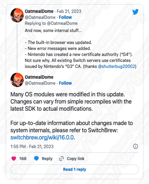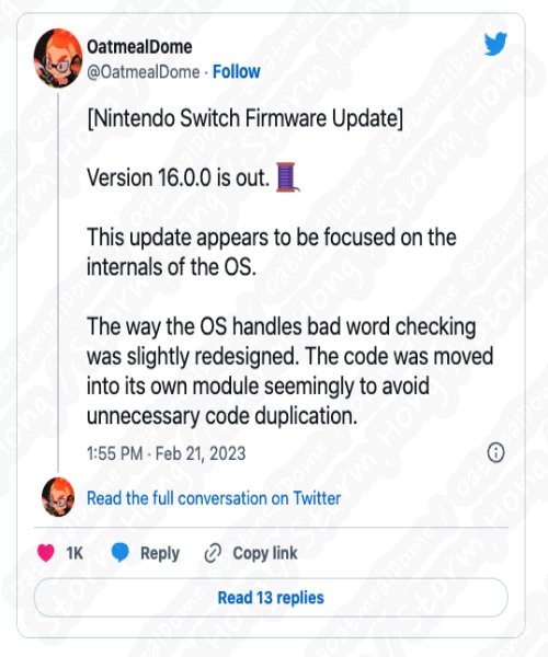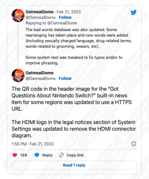 OatmelDome 으로부터 알려진 정보에 의하면, 이러한 변경 외에도 새로운 Nintendo Switch 펌웨어 업데이트 및 공식적으로 알려지지 않은 문제에 대해서 정보를 전했습니다. 이번 새로운 업데이트는 잘못된 단어의 데이터베이스와 잘못된 단어 확인 처리 방법을 변경했다는 정보와 함께 내장된 브라우저를 업데이트하는 동시에 새로운 메시지 오류를 추가하는 등 작업을 수행한 것으로 정보에 대해 알렸습니다.