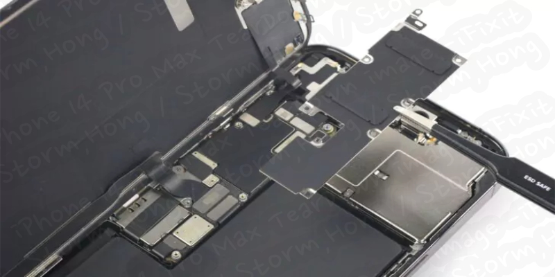 ↑ iPhone 14 Pro Max teardown showing the removal of the logic board, which is also houses the LPDDR5 RAM / Image Credits - iFixit