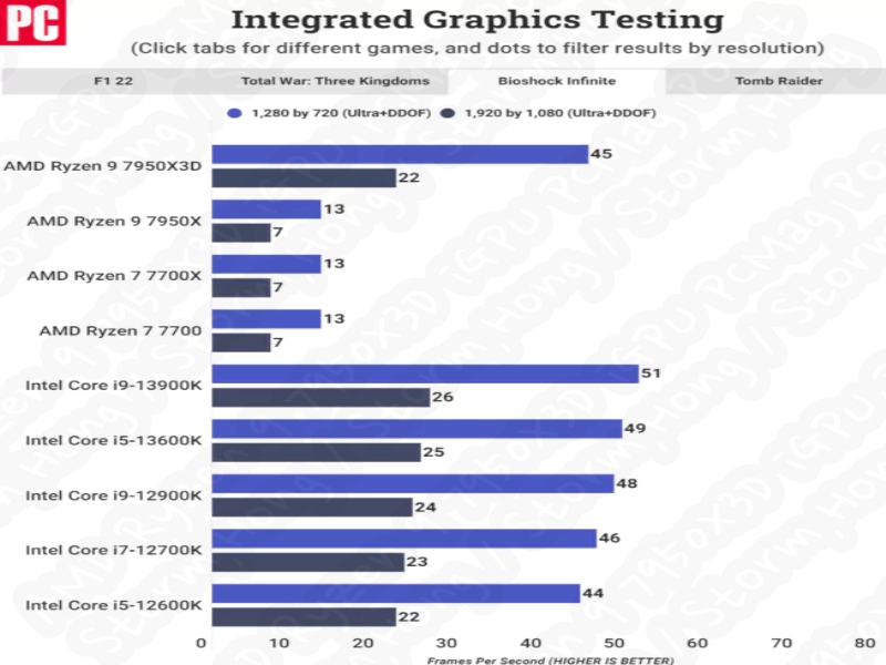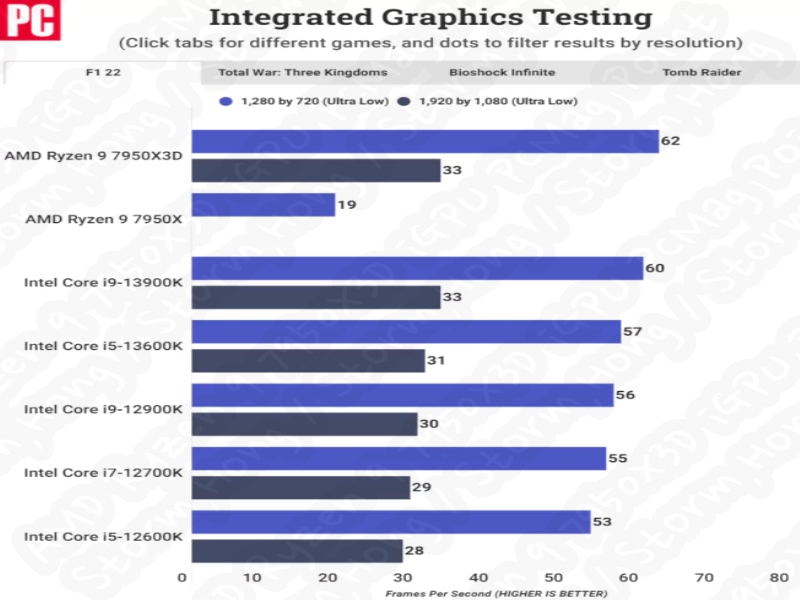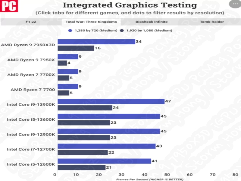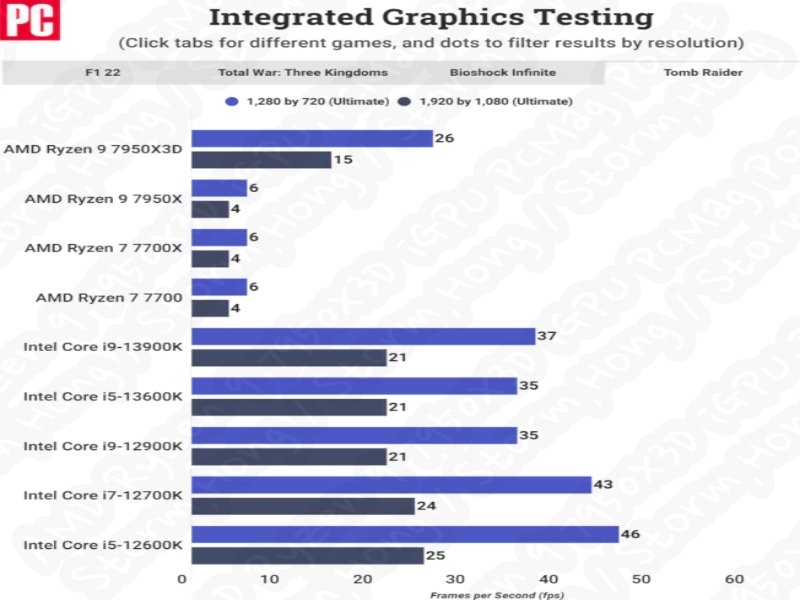 AMD Ryzen 9 7950X3D iGPU 성능 벤치마크 (크레딧: PCMag):