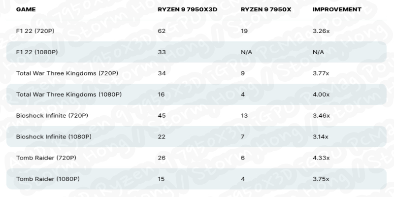 또한 PC MAG 에서는 새롭게 출시된 AMD Ryzen 7000X3D CPU 에 iGPU 를 테스트했으며, 그 성능은 놀라운 결과를 보여주었다는 정보를 전했습니다. 따라서 게임 성능은 수행된 벤치마크를 통해 3D V-Cache 를 적용하지 않은 CPU 에 비해 720p 해상도에서 4.3 배, 1080p 성능에서 최대 4배 높은 성능을 보여주었다고 알려졌습니다. - 테스트에 사용된 제품은 F1 2022, Total War: Three Kingdoms, Tomb Raider, and Bioshock Infinite 로 알려졌습니다. 또한 성능은 3D V-Cache 는 APU에서의 향상성능을 잘 보여 주었습니다.