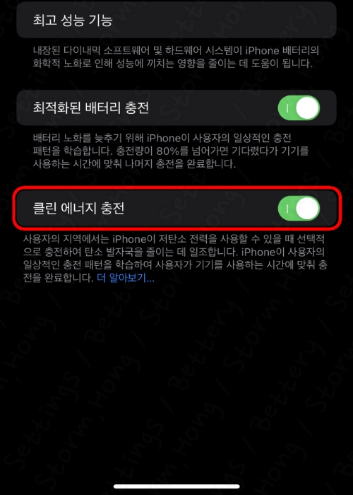 *중요한 점: Apple 에서 아이폰 클린 에너지 충전을 사용하여 사용자의 지역에서는 iPhone이 저탄소 전력을 사용할 수 있을 때 선택적으로 충전하여 탄소 발자국을 줄이는 데 일조한다고 알려졌으며, iPhone 사용자의 일상적인 충전 패턴을 학습하여 사용자가 기기를 사용하는 시간에 맞춰 충전을 완료하는 기능을 포함하고 있다는 것입니다. 하지만 충전 속도가 느려질 수 있으며, 좀 더 빠르게 하려면 이 기능을 위에서 설명한 방법으로 끄고 사용하기 바랍니다.