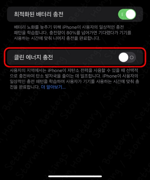 [ 느려진 아이폰 충전 도 클린 에너지 충전 (Clean Energy Charging - 청정 에너지 충전) 옵션 해제로 해결 ]