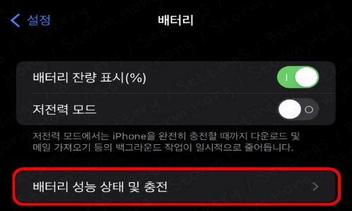 3. ↓ 배터리 성능 상태 및 충전을 눌러 줍니다.