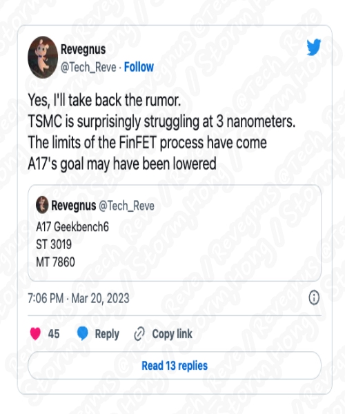 Revegnus 는 트윗을 통해 현재 TSMC 3nm 칩을 공급이 어려워 짐에 따라 Apple 은 3nm 칩 수급에 어려움을 겪고 있다는 새로운 정보가 나타났습니다. 그 이유에 대해서 Revengus 는 A17 Bionic 에 들어가는 목표 수율이 낮아진 것 같다는 예상, 예측, 루머, 소문의 정보를 전했습니다. 일전 Revengus 는 iPhone 15 Pro , iPhone 15 Pro Max 에 탑재될 것으로 알려진 칩셋의 싱글코어 및 멀티코어 점수에 대한 소문에 대해 공개했습니다. 그러나 이번에 나타난 사태로 인해 성능이 하락할 것으로 보인다는 새로운 예상, 예측, 루머, 소문의 정보를 다시 전했습니다.