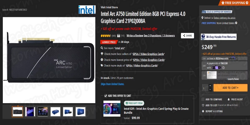 ↑ Intel Arc A750 GPUs on sale, Source: Newegg